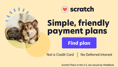 Did you know that we offer affordable financing options for our clients? We have partnered with ScratchPay to provide you with the option to finance your pet’s healthcare.